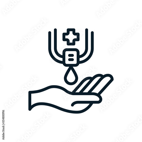 Disinfection. Washing hand with sanitizer liquid soap, gel outline icons. Vector illustration. Editable stroke. Isolated icon suitable for web, infographics, interface and apps.