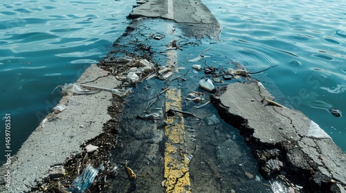 Disintegrating Pathway Over Water Surrounded by Debris and Waste