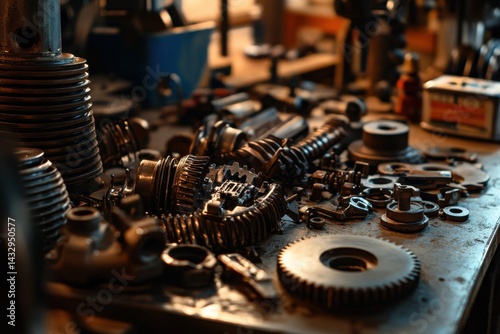 Dismantled auto transmission gears arranged on a workbench in a mechanical workshop setting, Auto transmission gears dismantled, workbench setting, high contrast light, detailed closeup