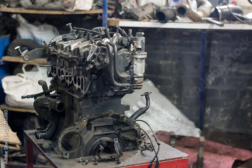 Dismantled car engine placed on a wooden pallet inside a garage environment