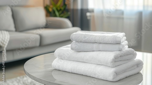 Display white towels on table with blurred living room background for product presentation.