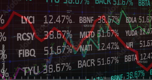 Displaying digital financial chart at trading desk, with tickers, percentages, colored line graphs