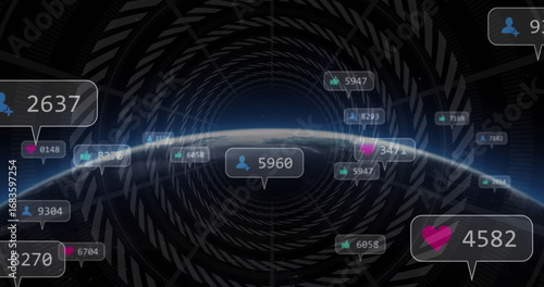 Displaying Earth horizon with floating notification bubbles in outer space, geometric tunnel