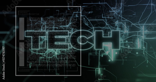 Displaying glowing TECH text floating in virtual interface, with neon circuit lines and code window