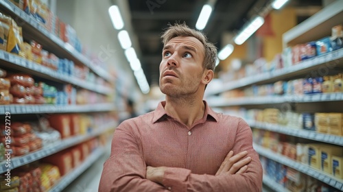 Displeased customer with limited product choices. Featuring a retail store aisle with empty shelves