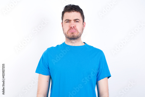 Displeased upset young handsome caucasian man wearing blue t-shirt against white backgfrowns face as going to cry, being discontent and unhappy as can't achieve goals, Disappointed model has troubles
