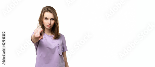 Displeased young woman pointing finger at camera, blaming you, isolated on white background. Place for your text