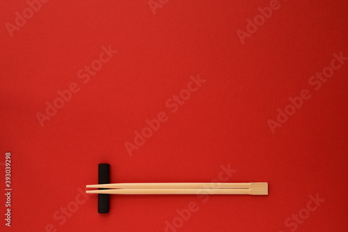 Disposable bamboo chopsticks on red background.