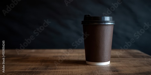Disposable brown coffee cup with a black lid on a rustic wooden table. Dark, moody background with copy space, perfect for cafe mockups.