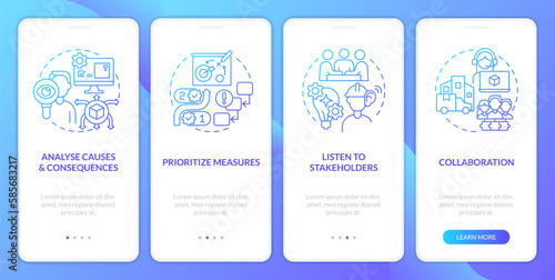 Disruption action plan blue gradient onboarding mobile app screen. Supply chain walkthrough 4 steps graphic instructions with linear concepts. UI, UX, GUI template. Myriad Pro-Bold, Regular fonts used