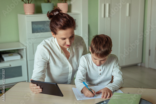 distance learning, online education at home during the covid-19 pandemic. family mom and son joyfully doing homework in the room using tablet