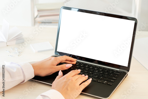 Distance work. Online communication. Business chat. Unrecognizable female hands typing on laptop blank screen on desk light workplace interior copy space.
