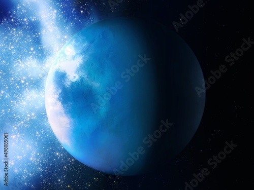 Distant planet near interstellar nebula in blue tones. Stellar nebula with Earth-like exoplanet in deep space.