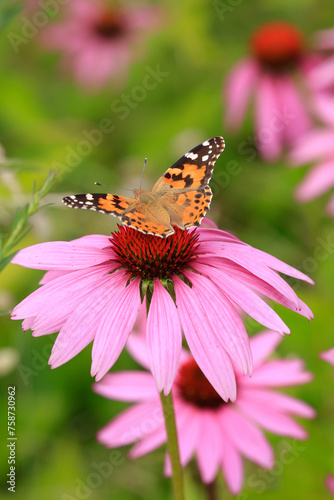 Distelfalter (Vanessa cardui) auf Sonnenhut-Blüte (Echinacea purpurea)