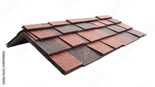 Distinctive roof shingles with a textured surface, showcasing a blend of red and charcoal colors, isolated on white.