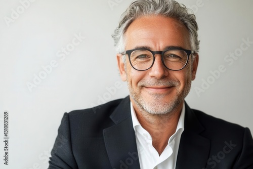 distinguished businessman with warm smile and stylish glasses, wearing charcoal suit against pure white background, professional corporate portrait with perfect lighting
