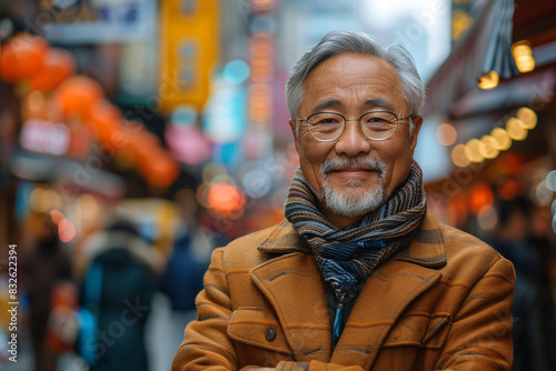 Distinguished Elderly Asian Man in a Coat and Scarf Standing Confidently in a Busy Street Market