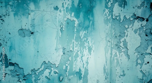 Distressed aquamarine wall with peeling paint creating an abstract texture