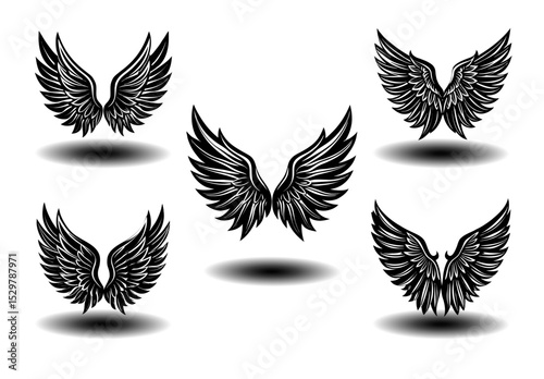 Distressed black feather angel wings vector set. Perfect for tattoo art, gothic designs, fantasy branding, spiritual prints, and memorial logos. Clean and detailed vector illustrations.