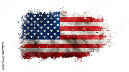 Distressed, grunge-style illustration of the American flag with a splatter effect around the edges, isolated on a white background. Represents patriotism, USA, and a textured, dynamic design.