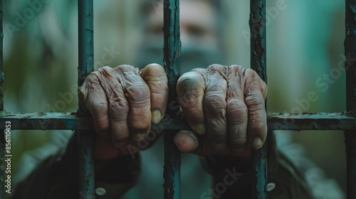 Distressed Hands Gripping Prison Bars in Blurred Environment