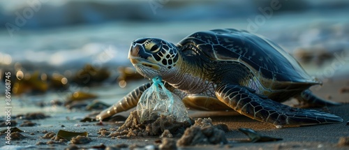 Distressed Sea Turtle Struggling with Plastic Debris Close to Shoreline