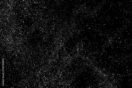 Distressed white grainy texture. Dust overlay textured. Grain noise particles. Snow effects pack. Rusted black background. Vector illustration, EPS 10.