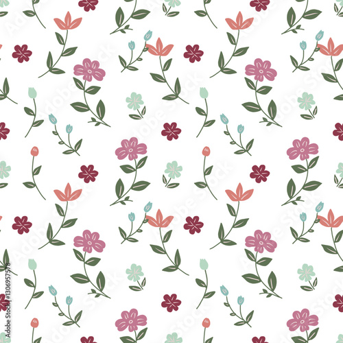 Ditsy floral seamless pattern with spring meadow flowers on white background.