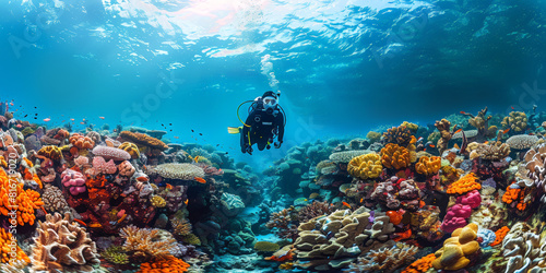 Diver exploring vibrant coral reef, ideal for environmental, underwater, and adventure themes. World Ocean Day.