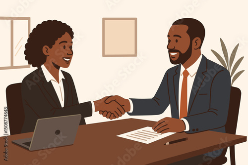 Diverse African American business professionals shaking hands in modern office conference room - successful partnership deal agreement vector illustration