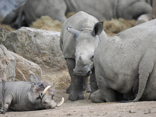 Diverse African Animals: Rhinos and Warthog Together at the Zoo
