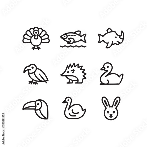 Diverse Animal Icons A Collection of Line Art Designs Featuring Birds, Mammals, and Fish
