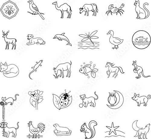Diverse Animal Icons Line Art, Wildlife, Cute Creatures, Simple Drawings