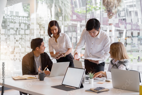 Diverse asian young startup business group working together and sharing idea at modern office.