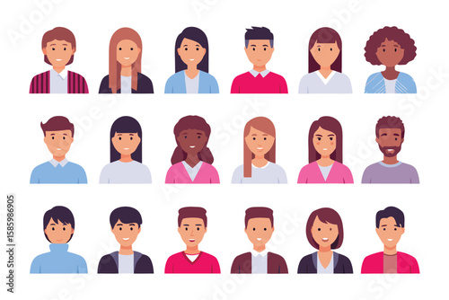 Diverse Avatar Set: A collection of twenty diverse cartoon avatars representing a variety of ethnicities and genders. Ideal for website design, social media, or app development.