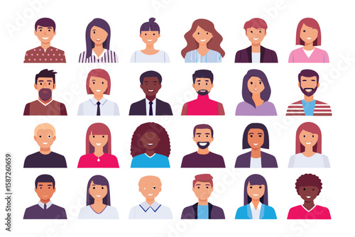 Diverse Avatars: A vibrant collection of modern, stylized avatars. Showcasing a spectrum of faces representing various demographics, cultures, and personalities.