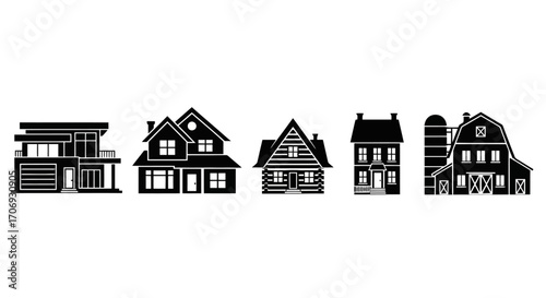 Diverse Black and White House Silhouettes Representing Various Architectural Styles for Real Estate and Home Design Projects