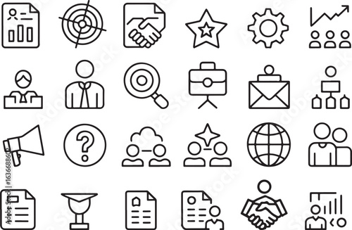 Diverse Business Icon Set Collection Outline Vector Illustration Depicting Teamwork Success Growth Analysis Target Global Communication and Leadership Development for Corporate and Startup Projects