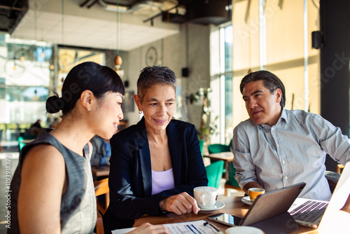 Diverse business people having meeting in modern cafe