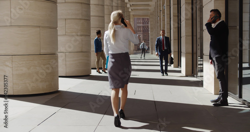 Diverse business people walking and standing outside business center
