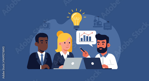 Diverse business professionals collaborate on innovative strategies, analyzing data and generating new ideas for successful project development and growth.