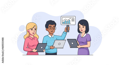 Diverse business team analyzing data on laptops and a presentation board. Ideal for websites, presentations, and marketing materials.