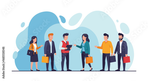 Diverse business team collaborating and discussing ideas, representing teamwork, communication, and professional development in a modern office environment.