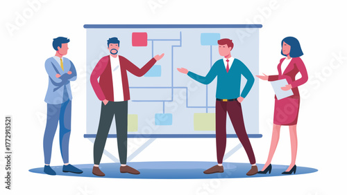 Diverse business team collaborating and presenting a project flowchart on a whiteboard during a meeting