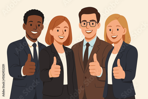Diverse business team collaboration success. Professional men and women in suits giving thumbs up gesture. Corporate teamwork, positive attitude, office staff approval, leadership, motivation concept