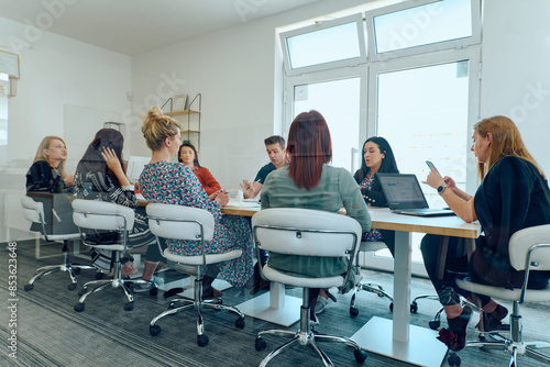 Diverse Business Team Discussing Projects in a Modern Glass Office.