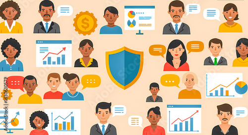 Diverse Business Team Working Together with Data, Communication, and a Shield Icon for Security