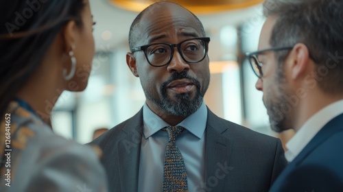 Diverse businesspeople networking, conference hall, serious discussion, professional event