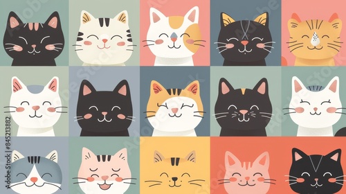 Diverse cartoon cats, all smiling with eyes closed, in various shapes and sizes, on a pastel backdrop