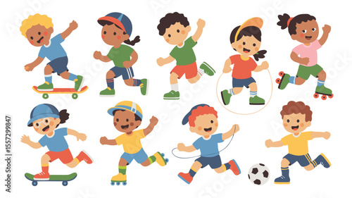 Diverse Cartoon Children Playing Soccer, Skateboarding, Roller Skating, and Skipping Rope Outdoors